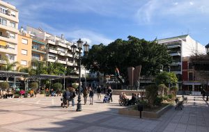 Da entscheidet Christa das wir nun doch nach Fuengirola fahren. Und so mache ich den Roller startklar während Christa Jimmy verpflegt. Um 12 Uhr starten wir. Mit 70 km/h auf der 2-spurigen Schnellstrasse und das mit kräftigen Windböen von allen Seiten. In Fuengirola angekommen fahren wir erstmal die einige kilometerlange Promenade ab. Zahlreiche Shop’s und Restaurant’s haben offen. Viel Verkehr und viele Fussgänger sind unterwegs. Dann stellen wir den Roller ab und gehen zu Fuss weiter. Nun sieht die Sache schon anders aus. Die Shops verkaufen hauptsächlich Souvenirs und die Restaurants sind nicht so unser Ding. Wir gehen was weg von der Promenade und kommen auf die Plaza de la Constitution.